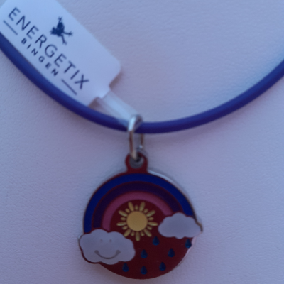 Le soleil, les nuages, la pluie et un arc-en-ciel multicolore se retrouvent sur ce pendentif pour enfants et forment un ensemble des plus ravissants. La surface est recouverte de résine époxy qui souligne intensivement les couleurs gaies. Le point fort est composé par les deux nuages dont la surface de couleur brille en bleu dans le noir.